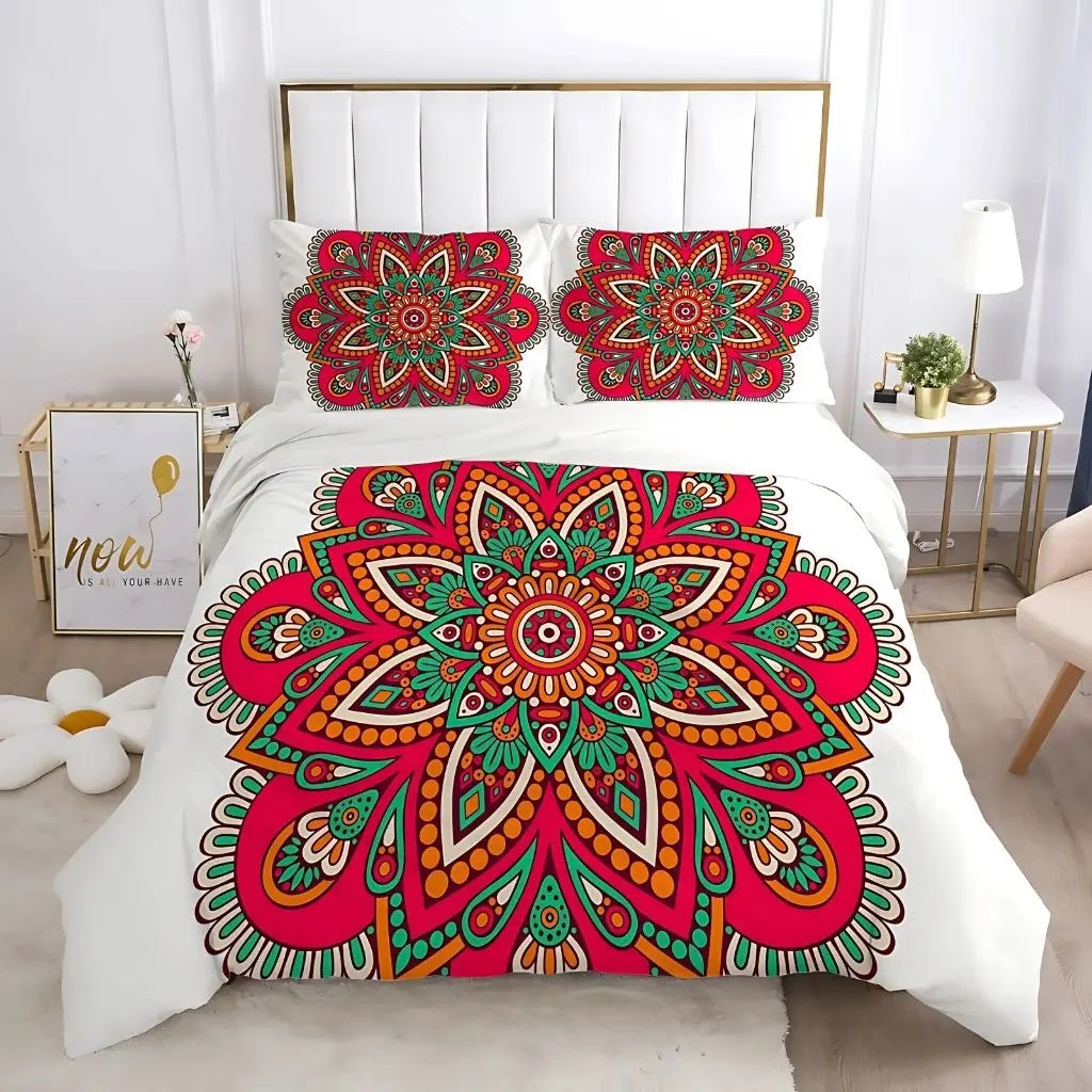 Transform your bedroom into a celestial retreat with this striking 3D-printed bedding set, featuring intricate geometric patterns and dreamcatcher-inspired details in bold metallic tones. The smooth twill weave and reactive dye process create rich, lasting color that enhances any modern space with depth and character.